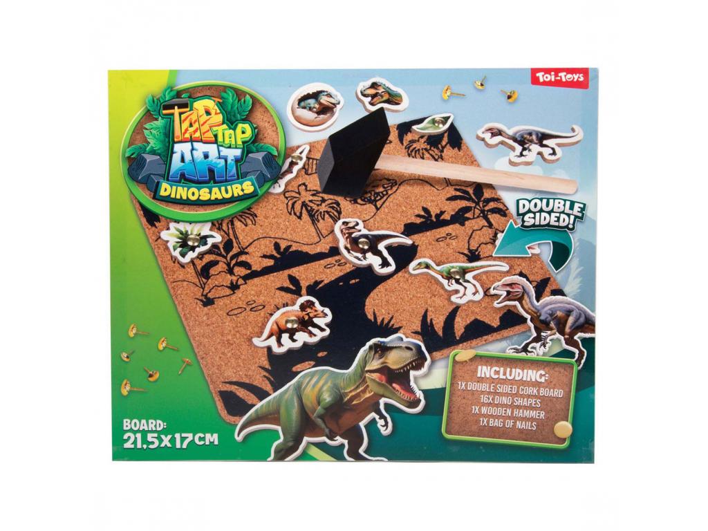 Készlet egy keresztirányú parafatáblával és dinoszauruszfigurákkal, amelyeket kalapáccsal kell rögzíteni. 4 éves kortól alkalmas.