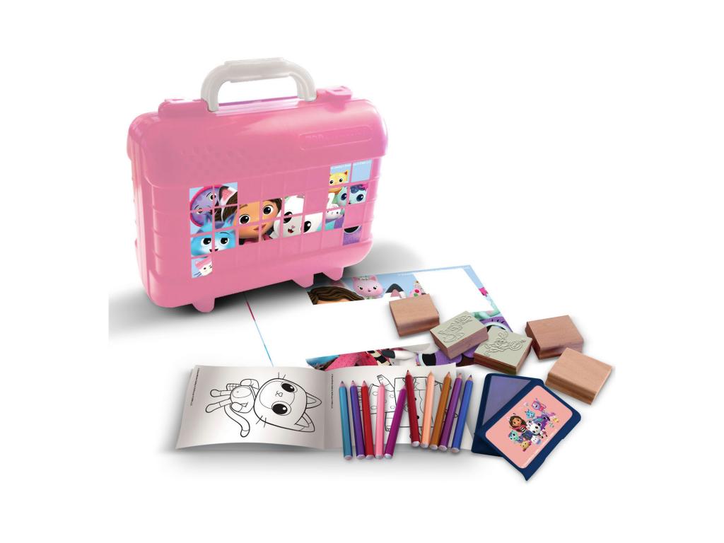 Tartalom: 10 színes ceruza, 1 mosható, nem mérgező bélyegzőpárna, 5 bélyegző, 1 tevékenységi könyv és 64 puzzle matrica. Ezeket a puzzle matricákat a bőrönd külsejére ragasztva Gabby és kedvenc barátai képét állíthatod össze.
