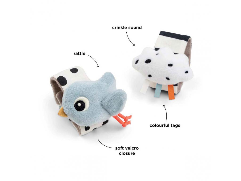 A Happy Clouds csörgő karkötő szett két puha, kék részletekkel díszített babakarkötőből áll, ideális 0 hónapos kortól. Érzékszervi stimulációra, testtudatosságra és kézfelismerésre fejlesztették ki. Ezek a karkötők kontrasztos pontokkal, csíkokkal és színes elemekkel rendelkeznek a vizuális interakció érdekében. A csörgő és recsegő hangok további hallási élményt nyújtanak. Az egyik karkötő pontokkal és kék madárral, a másik csíkokkal és felhővel díszített. Ezek a csörgők tépőzárasak, így könnyen fel- és levehetők, és mind a csuklóra, mind a bokára felhelyezhetők. Jellemzők 0 hónapos kortól alkalmas Madárka: 6 cm Felhő: 6 cm Maximális kerület: 14 cm 40 °C-on mosható. Ne szárítsa szárítóban.