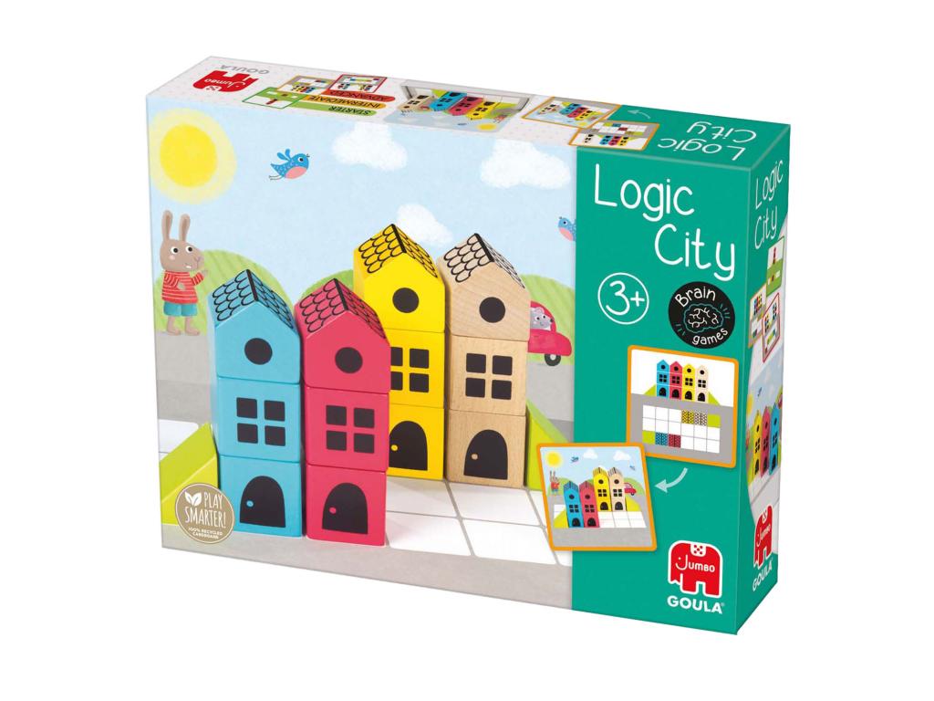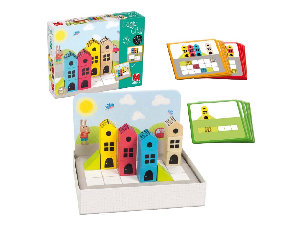 Goula Logic City Oktatási óvodás játék, amelynek célja, hogy a fa darabok segítségével a kártyák mintáit a térbeli elrendezésüknek megfelelően helyesen összeállítsák. A doboz a játék alapját képezi, és a játékdarabokat a kártyán feltüntetett módon kell elhelyezni. Ezek a kártyák fokozatosan növekvő nehézségi fokozatúak (összesen három) és új pozíciók és színek hozzáadásával változnak. Önkorrekciós játék, mivel minden kihívás megoldása a hátoldalon található, így a kicsik maguk is rájöhetnek a megoldásra. Egyedül is játszható, az egyes kihívások megoldásával, vagy több játékossal, ahol a gyerekek egymás ellen versenyeznek. Biztonsági figyelmeztetés: 3 éves kor alatti gyermekek számára nem alkalmas. A doboz tartalma: 14 színes fa darab, 45 kihíváskártya 3 nehézségi szinttel, talp (fordítható) és díszített háttér.