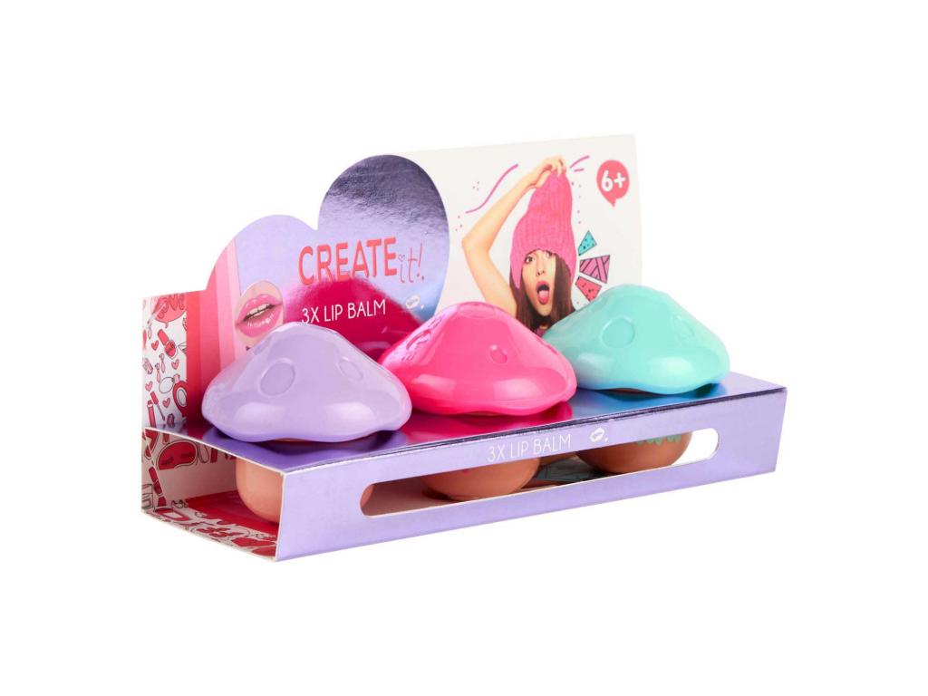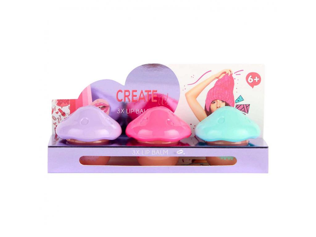 Create It! Beauty ajakápoló balzsam, színes, gomba alakú tárolóban. 6 éves kortól alkalmas. 3 részes szett.