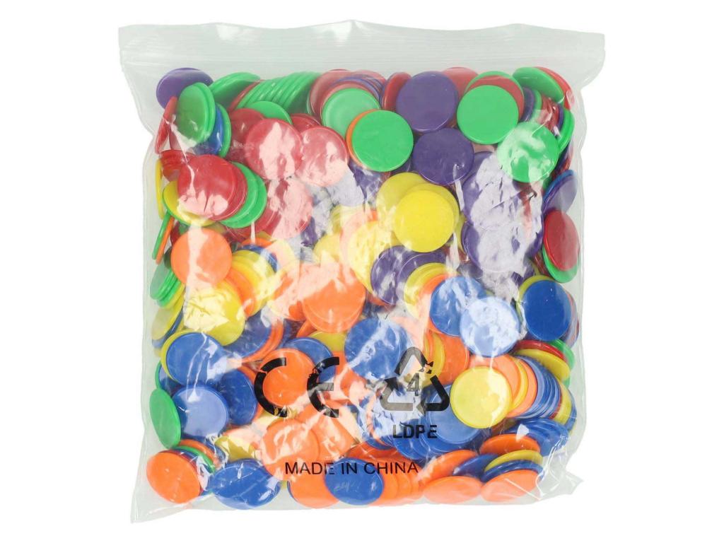 500 színes zsetonból álló készlet. Minden zseton átmérője kb. 1,9 cm. 3 év alatti gyermekek számára nem alkalmas. Számoláshoz, válogatáshoz és tanórai használatra is alkalmasak.