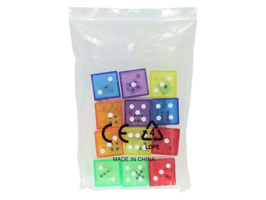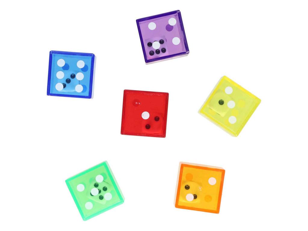 6 darab átlátszó dobókocka, átmérőjük kb. 3,3 cm, mindegyikben egy kisebb dobókocka található. Színes műanyagból, pontokkal. Ideális matematikai feladatokhoz és játékokhoz.