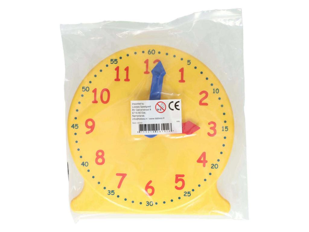 30 centiméteres, élénk sárga színű tanuló óra, 1-12 óra osztással és 0-60 perc/mp beosztással. Ideális otthoni vagy iskolai használatra az idő és órahasználat tanulására.