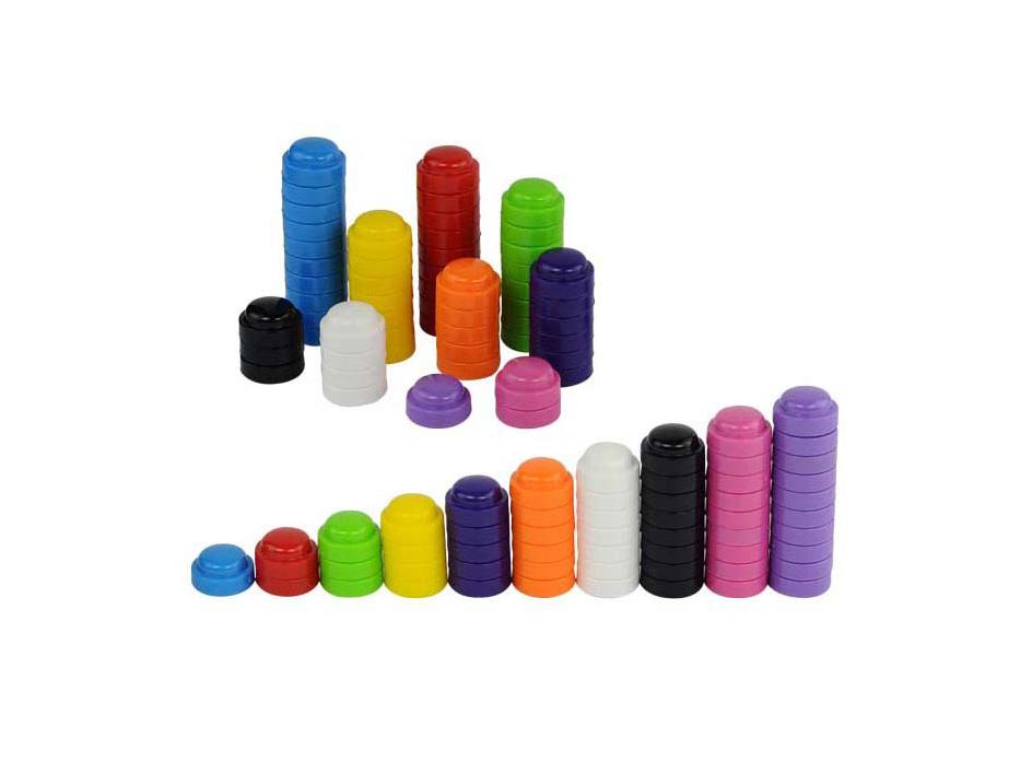 1000 darab műanyag számoló gomb, átmérőjük kb. 2 cm. A különböző színű gombok könnyen egymásra rakhatók. Számoláshoz, válogatáshoz és tanórai használatra is alkalmasak.
