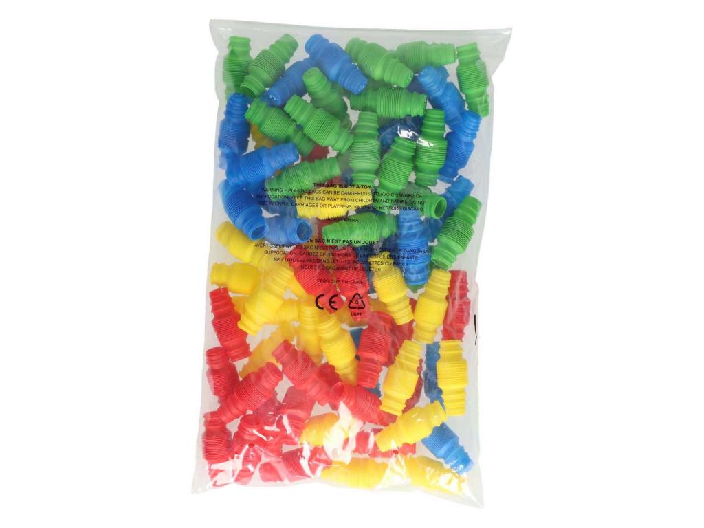 Ez a 80 kihúzható, rugalmas harmonika csőből álló szett, piros, kék és sárga rugalmas műanyag csövekből áll. Összekapcsolhatók, rugalmasak és ideálisak a 3 évesnél idősebb gyermekek érzékszervi játékához és motorikus fejlődéséhez.