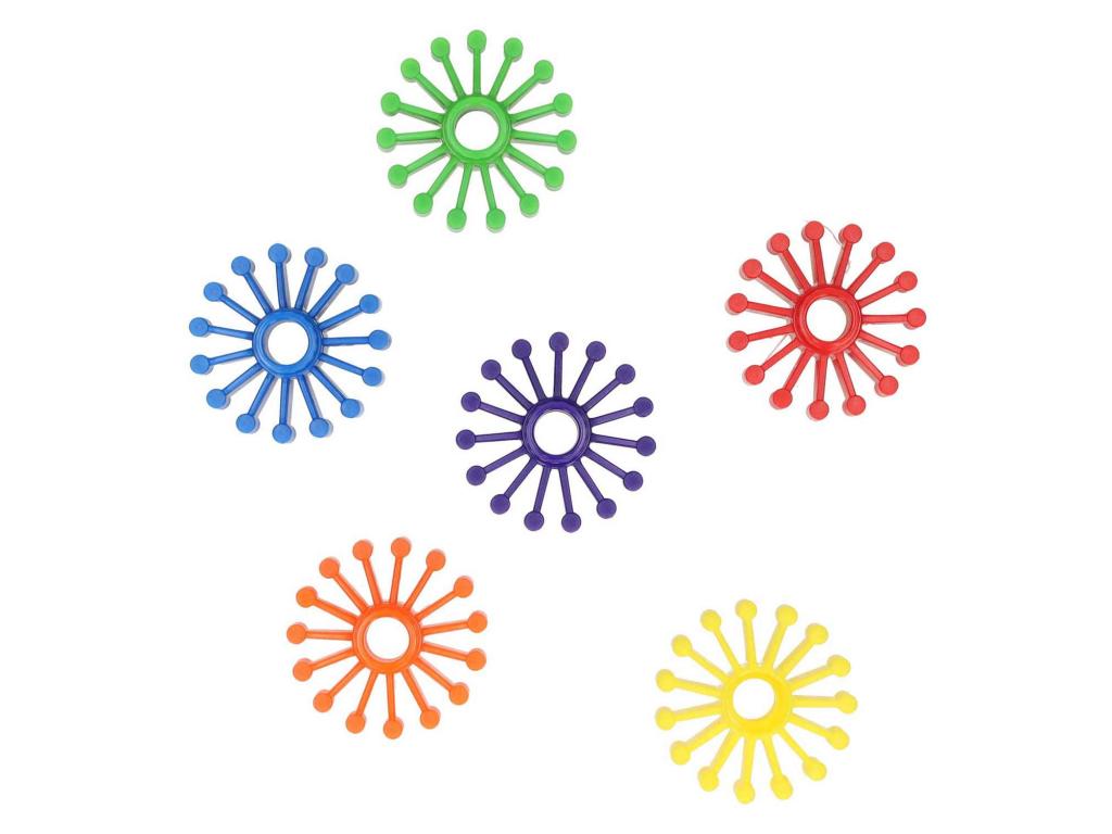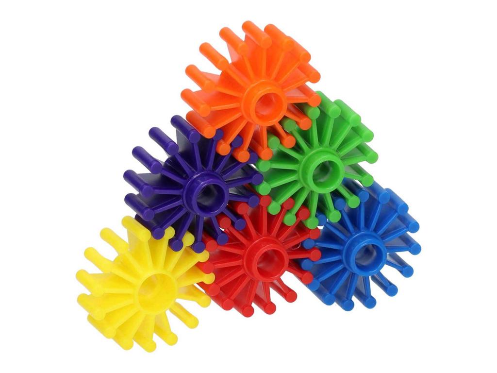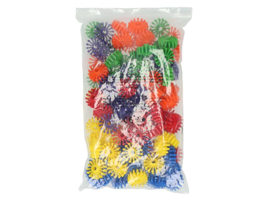 96 darab, kerék alakú műanyag építőelem, mindegyik kb. 4 cm hosszú. Az elemek hat élénk színben kaphatók és könnyen összerakhatók. Ideális kreatív építkezéshez és tanuláshoz.