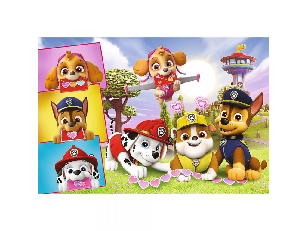 A kép színes, vidám és tele van szeretet-szimbólumokkal szívecskékkel, mosolyokkal és kedves üzenetekkel, amelyeket a kutyusok levelek formájában küldenek egymásnak. A háttérben felbukkan a híres őrtorony is, így a gyerekek azonnal a Mancs Őrjárat világában érezhetik magukat.