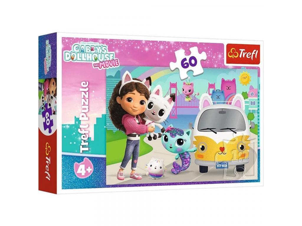 Fedezd fel Gabi babaházas világát a mozi varázsával fűszerezve! A Trefl Gabi babaháza A film 60 darabos puzzle egy igazán színes és kedves képet rejt, amelyben Gabi és cicás barátai köztük Pandy Paws, Mercat és a csillogó Kitty Wagon közösen indulnak útnak egy újabb kalandra. A háttérben szivárvány, napfény, aranyos épületek és a jól ismert híd varázsolják még hangulatosabbá ezt a mesés jelenetet.
