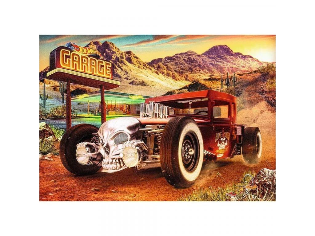 A jelenet egy klasszikus amerikai sivatagi útszéli Hot Wheels garázsnál játszódik, háttérben naplementével, kaktuszokkal, poros hegyekkel igazi western-hangulat modern, lendületes stílusban. A középpontban természetesen a legendás Bone Shaker áll, koponyadíszes orrával és hatalmas kerekeivel. A gyerekek számára ez a puzzle nemcsak vizuális élmény, hanem egyfajta kaland is, amelyet darabról darabra élhetnek át.