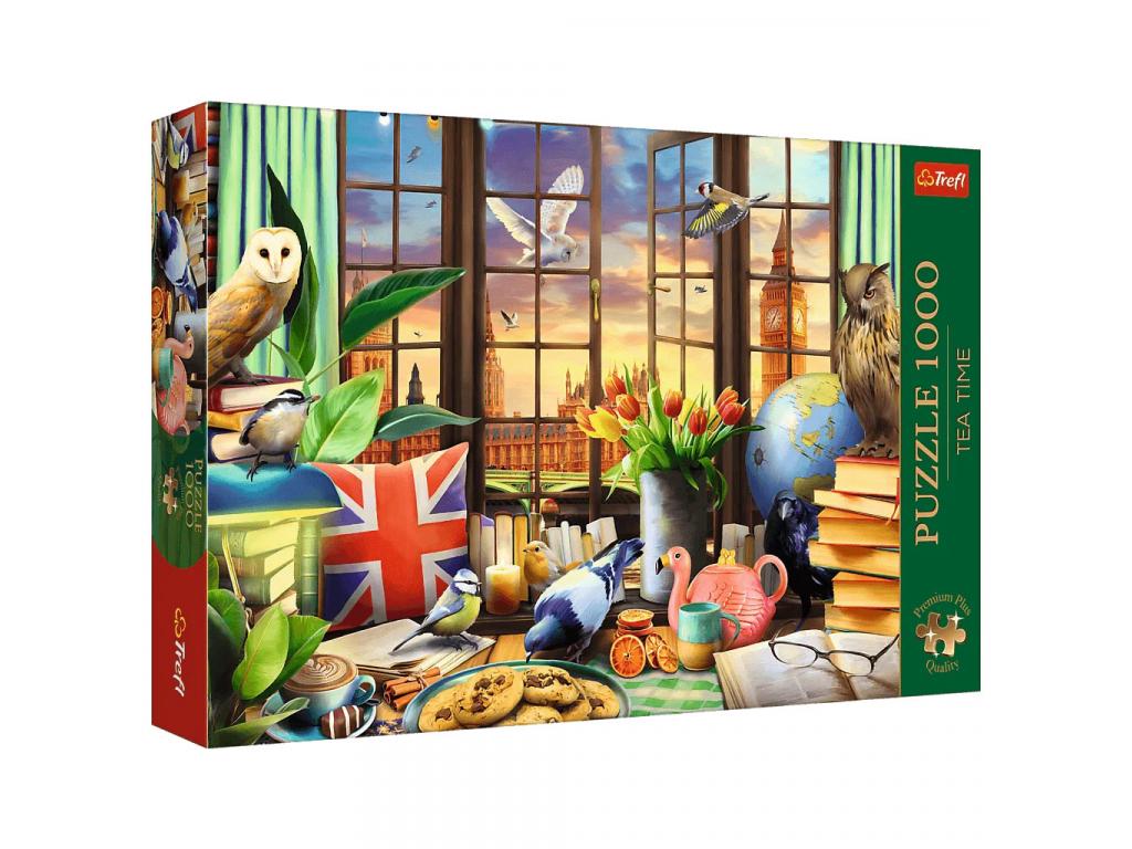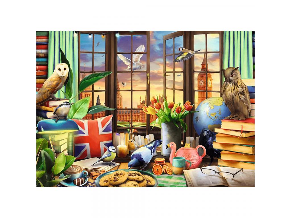Utazz el képzeletben London szívébe anélkül, hogy kilépnél az ajtón! Az Angol délután Teázás madarakkal Londonban című 1000 darabos puzzle a Tea Time sorozat részeként egy varázslatos hangulatú, festői jelenetet tár eléd: egy madarakkal teli angol nappalit, amelynek ablakából páratlan kilátás nyílik a Big Benre és a Westminster-palotára. A Union Jack párna, a teáscsésze, a csokis kekszek, a virágos váza és a könyvek között barátságos madarak gyülekeznek egy tökéletes pillanat az angol életérzésből.