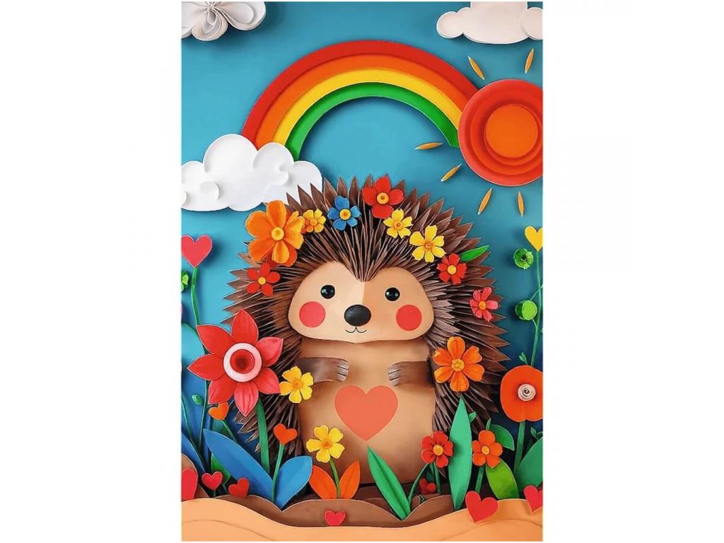 A kép stílusa a papírművészet világát idézi, amely még különlegesebb és játékosabb hangulatot kölcsönöz a kirakónak. A virágok, a színes szivárvány, a napocska és a felhők háromdimenziós hatást keltenek, így a kép szinte életre kel a kirakás során. A kisgyermekek imádni fogják a barátságos sünit, és örömmel rakják össze újra meg újra ezt a kedves jelenetet.