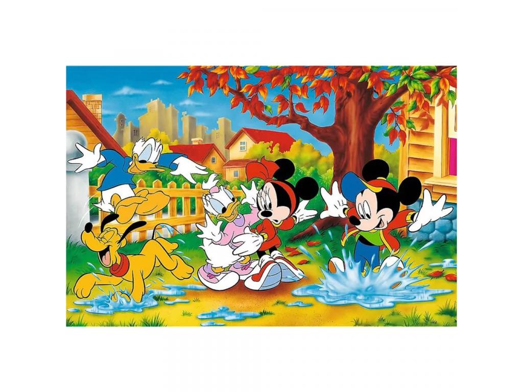 A kirakón Mickey egér, Minnie, Donald kacsa, Daisy, valamint Pluto elevenednek meg egy napfényes, őszi kertben, ahol önfeledten ugrálnak a pocsolyákban, nevetnek és együtt játszanak. A háttérben színes falevelek, meleg színekben pompázó házak és egy barátságos városka idézik meg a klasszikus Disney hangulatot, amit minden generáció örömmel ismer fel.