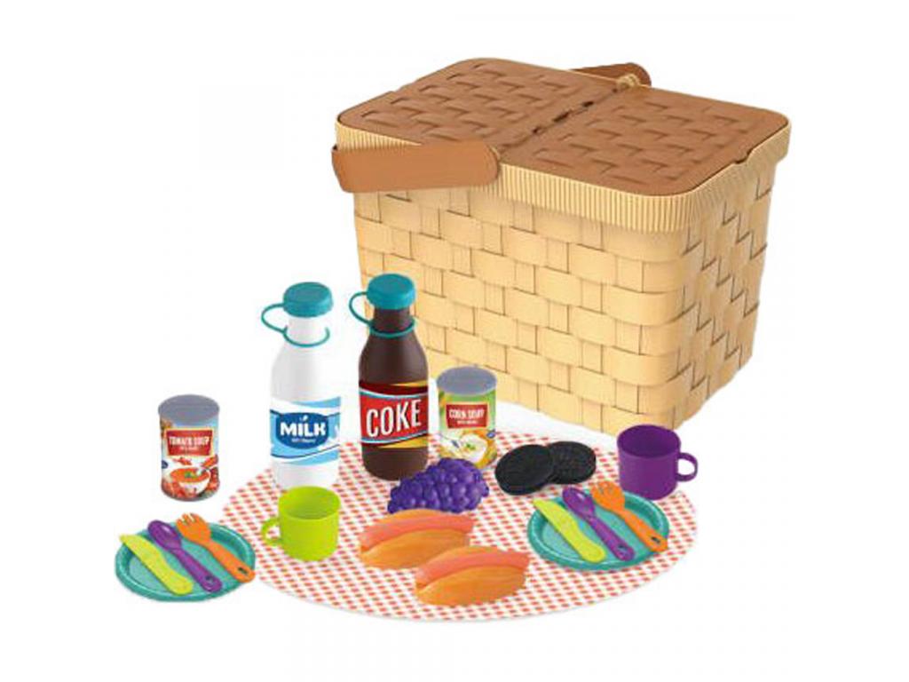 A csomagban találtok műanyag tányérokat, evőeszközöket, poharakat, italos flakonokat, gyümölcsöket, konzerveket, szendvicset és még egy klasszikus kockás piknik terítőt is. A készlet úgy lett kialakítva, hogy a gyerekek eljátszhassák a közös étkezést, tálalást, sőt még a piknik utáni elpakolást is hiszen minden visszacsomagolható a kosárba.