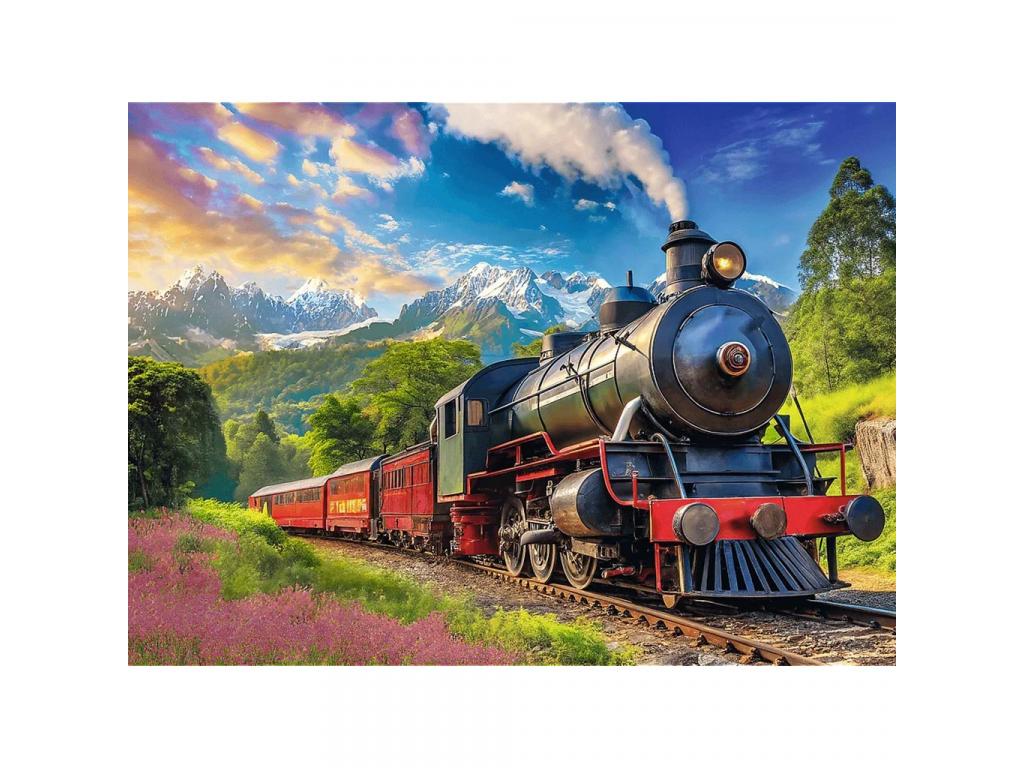 Ez a lenyűgöző Trefl puzzle egy klasszikus gőzmozdonyt ábrázol, amint vörös kocsijait húzva szeli át a festői, hegyvidéki tájat. A háttérben hófödte csúcsok, zöldellő erdők és virágzó mezők nyújtanak idilli látványt, miközben a vonat füstöt eregetve robog végig a sínpáron. Ez a kép nemcsak a vasút szerelmeseinek nyújt maradandó élményt, hanem mindenkinek, aki szereti a természet és az utazás romantikus hangulatát.