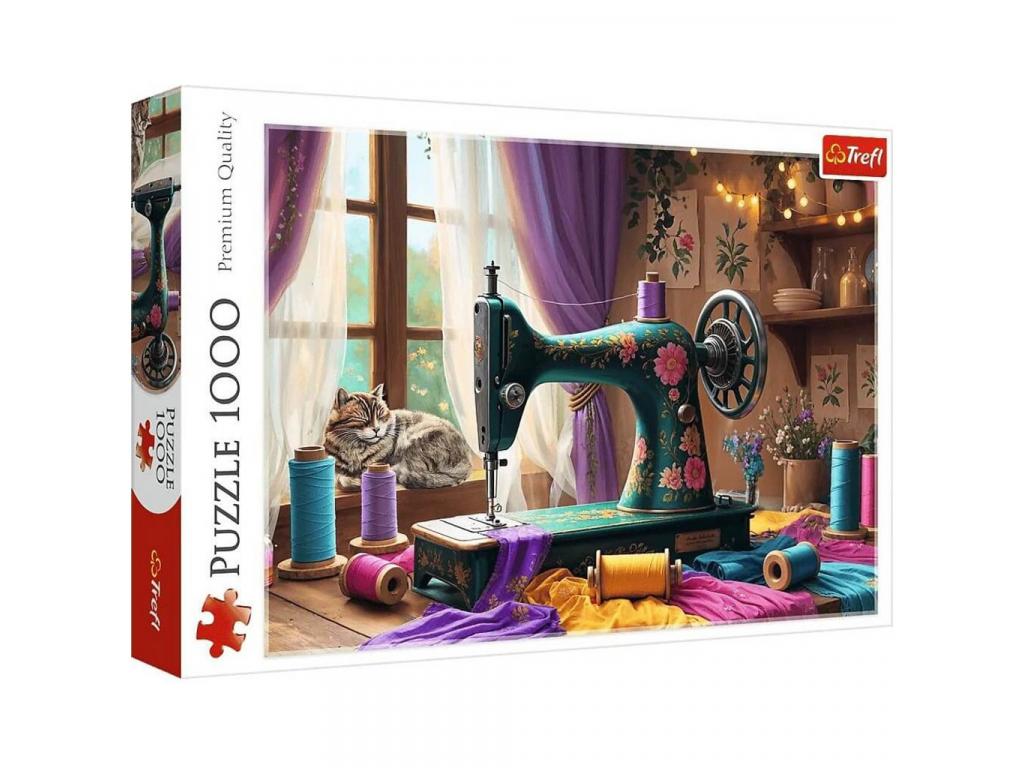 Merülj el a kreativitás és nyugalom világában a Trefl A varrószoba 1000 darabos prémium puzzle-jével! Ez a hangulatos, részletgazdag jelenet egy varrószobába repít, ahol egy díszes, virágmintás régi varrógép és színes anyagok, cérnák, valamint egy szundikáló cica együtt teremtik meg az otthonos és inspiráló atmoszférát. A lila függönyökön átszűrődő napsugár, a falon lógó növényillusztrációk és a fonalak tarkasága mind-mind aprólékos figyelemmel kidolgozott elemek, amelyek kirakás közben fokozatosan bontakoznak ki előtted.