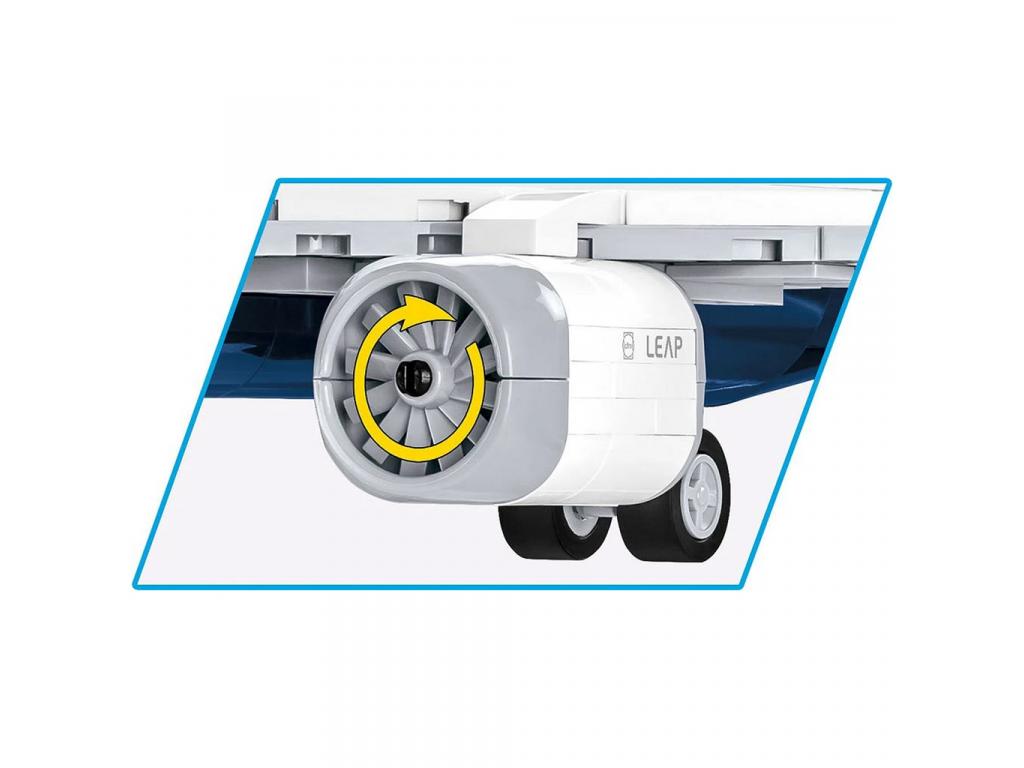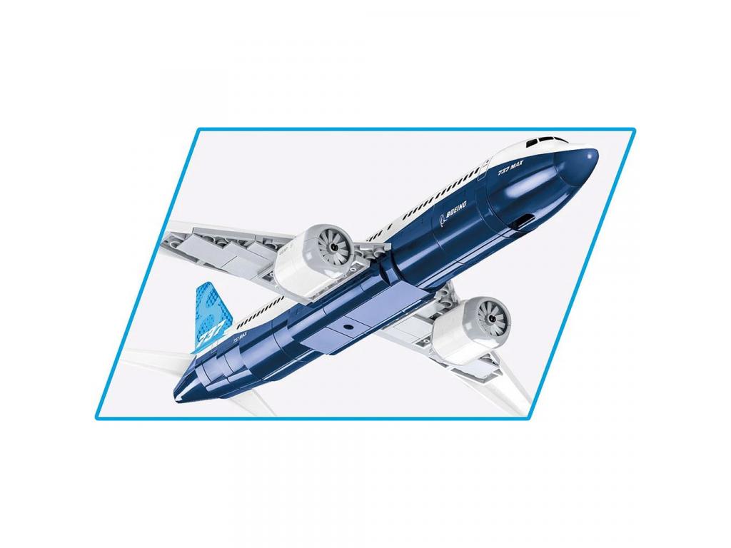 Ez a hangulatos COBI építőjáték-készlet lehetővé teszi a világ legnépszerűbb keskenytörzsű közepes hatótávolságú utasszállító repülőgépének, a Boeing 737-8 (más néven Boeing 737 MAX 8) modelljének megépítését. A készlet 340 kiváló minőségű építőelemet tartalmaz, amelyek 1:110 arányú méretarányban teljesen hűen tükrözik a valós jármű formáját. A modell forgatható kerekeken, hajtogatható leszállófelszereléssel, alul függesztett, rotort forgató motorokkal és egy elegáns, fekete kiállítóállvánnyal érkezik, amelyhez névtábla is csatlakoztatható.