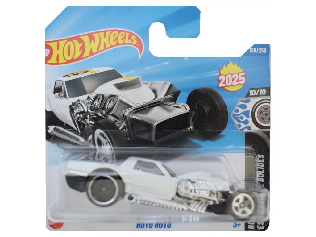A fehér karosszéria mellett a legfeltűnőbb elem a hatalmas, krómozott motor, amely szó szerint kiszakad a kasztniból, ezzel adva igazi hot rod megjelenést a modellnek. A hosszú kipufogók, a masszív első hűtőrács és a különleges arányok miatt a Hoto Roto inkább egy fantáziadús erőgép, mintsem egy hagyományos autó. A hatalmas hátsó kerekek és a keskeny első kerekek klasszikus dragster hangulatot idéznek, amit a Hot Wheels saját, játékos csavarral tett még különlegesebbé.