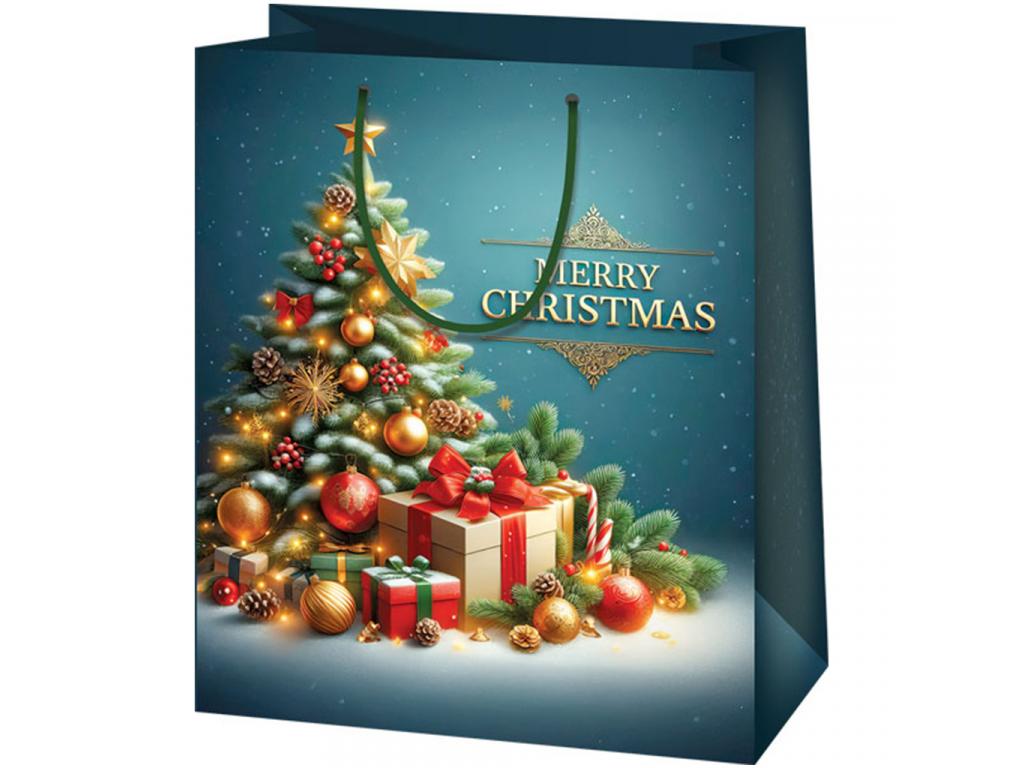Légy része az ünnepi varázslatnak ezzel az impozáns méretű (33x15x44 cm) Cardex ajándéktáskával, amelyen egy mesésen feldíszített karácsonyfa és fényárban úszó ajándékhalom kapott helyet. A táska alapszíne elegáns sötétzöld, arany dekorációval és Merry Christmas felirattal minden részletében a csillogó karácsonyi hangulatot tükrözi.