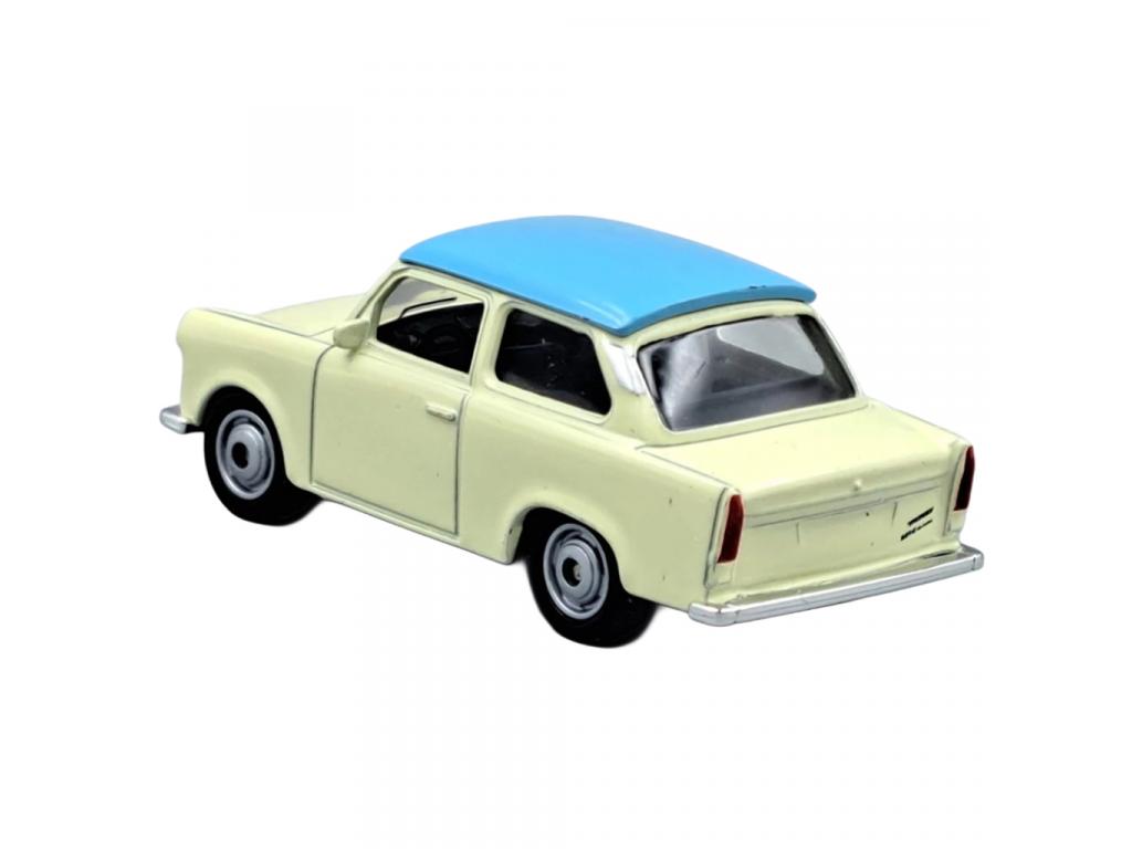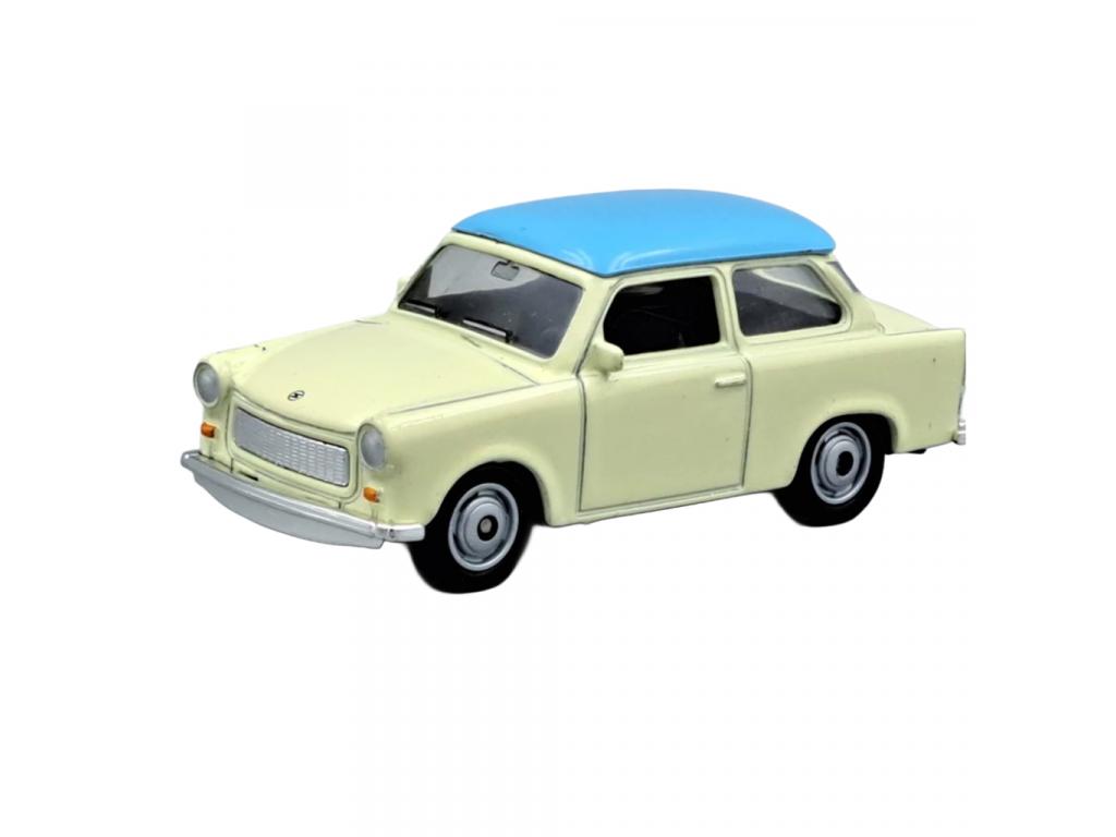 A Trabant 601 kisautó modell a Welly-től igazi csemege minden kisautó-rajongó gyermeknek és nosztalgiázó szülőnek! Ez az 1/64 méretarányú fém kisautómodell a híres keletnémet jármű hű mása, mely most elegáns fehér karosszériával és világoskék tetővel tér vissza egy igazi klasszikus, modern köntösben.