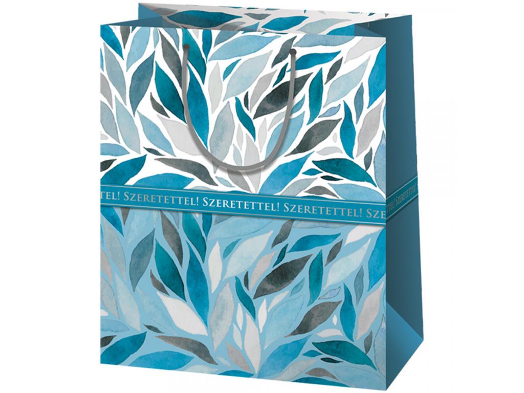 Ha igazán látványos és stílusos csomagolást keresel egy különleges ajándékhoz, ez a Cardex óriás méretű (33x15x44 cm) ajándéktáska tökéletes választás lesz. A modern, levélmintás dizájnt friss kék, szürke és fehér árnyalatok jellemzik, amelyeket vízfestékszerű hatás és harmonikus elrendezés tesz még különlegesebbé. A középen körbefutó sávon a Szeretettel! felirat többször is visszaköszön, így az üzenet egyértelmű: ez az ajándék szívből jön.
