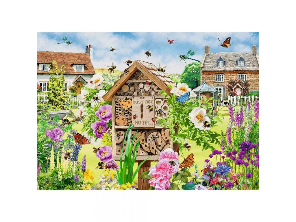 Merülj el egy idilli, virágoktól illatozó nyári kertben, ahol a méhek szorgosan repkednek a színes virágok között! A Zümmögő kert Méhecskék és virágok birodalma című 1000 darabos puzzle egy festői jelenetet ábrázol, melyben a természet csodálatos világa elevenedik meg. A középpontban egy aprócska méhhotel áll, melyet "The Busy Bee Hotel" felirat díszít, körülötte pedig virágok, méhek, lepkék és más rovarok nyüzsögnek igazi élmény a természet szerelmeseinek!