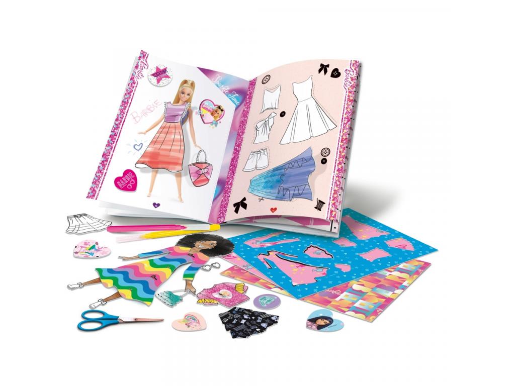 A készlet része egy gazdagon illusztrált, spirálos színezőkönyv, benne különböző ruhatervekkel, Barbie-figurákkal és stílusötletekkel. A csomagban található öntapadós ruhák, színes papírok, sablonok, filcek, olló és kiegészítők mind-mind arra ösztönzik a gyerekeket, hogy kreatív módon alkossanak akár új ruhákat tervezzenek, akár meglévő darabokat díszítsenek fel. A kivágható Barbie-babákra az elkészült szetteket rá is illeszthetik, így valóban életre kel a saját tervezésű divat.
