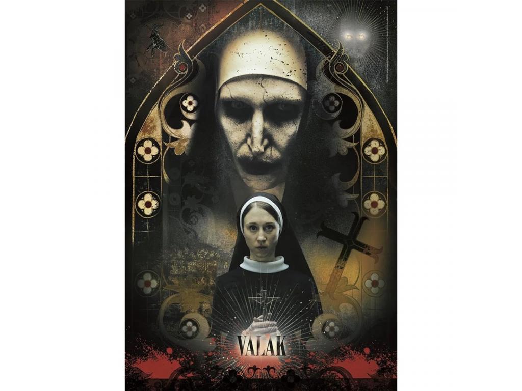 A kép középpontjában Valak fenyegető alakja áll, hátborzongató tekintetével, mögötte pedig katedrálisszerű gótikus díszítések és sötét vallási motívumok adják meg a dermesztő hátteret. Az előtérben egy fiatal apáca áll imára kulcsolt kezekkel, a feszület felett ott a neve: VALAK mintha figyelmeztetne arra, hogy itt nem egy szokványos puzzle-ről van szó.