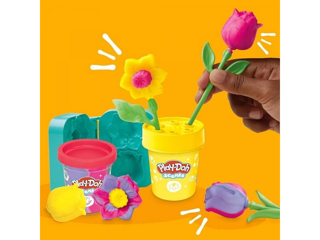 A szett 2 illatos Play-Doh gyurmát tartalmaz egy vidám sárga és egy rózsaszín-lila kevert színt így az elkészült virágok nemcsak szépek, de finom virágillatot is árasztanak. A csomag része egy bemutatóállvány is, amelybe a megalkotott virágokat be lehet tűzni, így a gyerekek saját kis kiállítást rendezhetnek a remekműveikből. Ez a játék nemcsak a kézügyességet és a kreativitást fejleszti, de az érzékszerveket is bevonja a játékba az illatok és a textúrák révén.