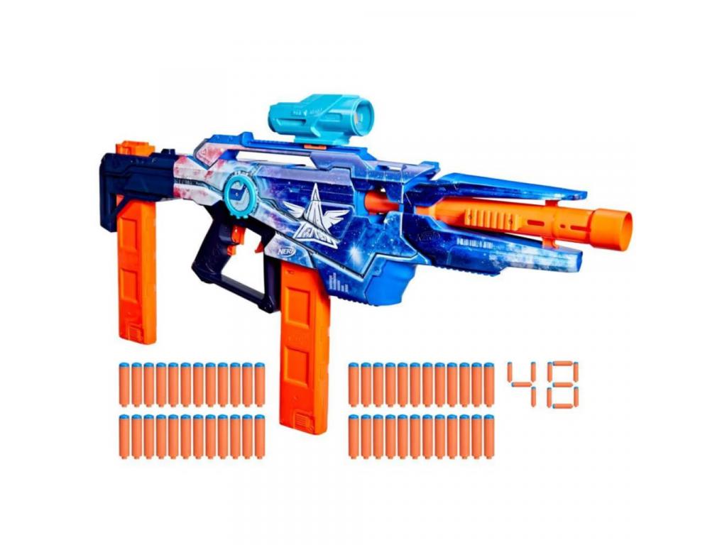 A blaster dizájnja lenyűgöző: galaxis mintás borítása, kék-narancs színei és futurisztikus kiegészítői (mint például a levehető célzó vagy a taktikai markolat) még élethűbbé és izgalmasabbá teszik a játékot. A 48 darab N1 típusú szivacslövedék a csomag része, ezek gyorsaságra, pontosságra és nagy távolságra lettek fejlesztve hogy a gyerek mindig előnyben legyen.