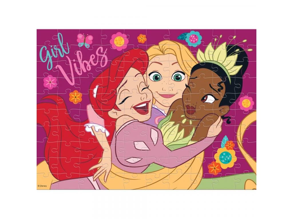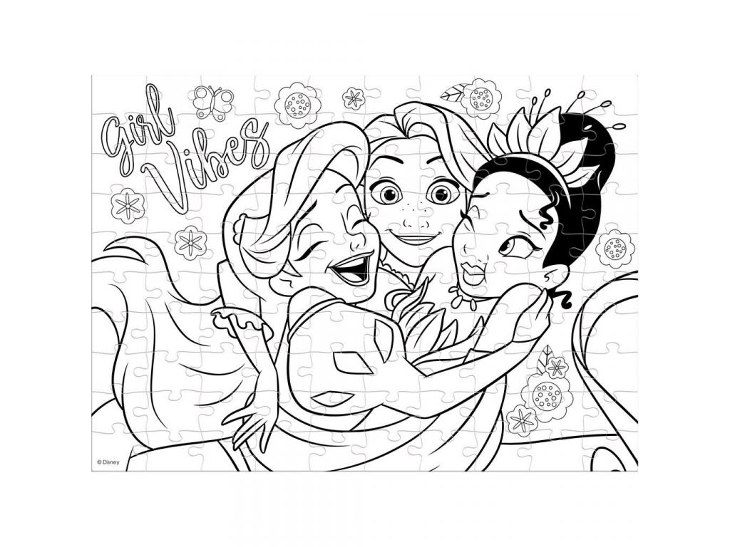Fedezzétek fel a varázslatot a Luna: Disney Hercegnők 2 az 1-ben Színezhető Puzzle segítségével, amely egyesíti a kirakózás és a színezés örömét! Ez a különleges, kétoldalas puzzle egyszerre fejleszti a kézügyességet, a figyelmet és a kreatív gondolkodást miközben a gyerekek kedvenc hercegnőikkel, Aranyhajjal, Ariellel és Tianával tölthetik az időt. Az egyik oldalon egy színes, vidám jelenet látható Girl Vibes felirattal, míg a másik oldal fekete-fehér, amit a gyerekek saját fantáziájuk szerint színezhetnek ki.