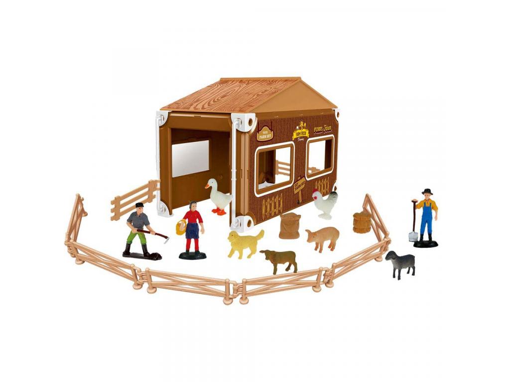 A készlet tartalmaz különböző háziállatokat, mint például kutya, bárány, kacsa, liba, kecske, kakas, malac és ló, valamint három farmer figurát is, akik segítenek a farm életének eljátszásában. A szénabálák, kerítéselemek, zsákok és a kis faépület mind hozzájárulnak a még valósághűbb játékhoz. A gyerekek saját történeteket találhatnak ki, miközben megtanulják, hogyan kell gondoskodni az állatokról és fenntartani egy farm működését.