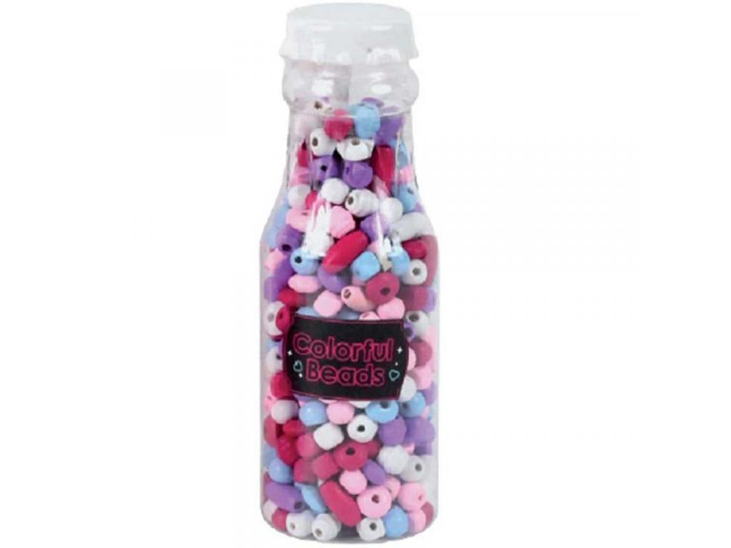 A stílusos, műanyag tejüveg formájú tároló tele van élénk színű, különböző formájú gyöngyökkel, amik között megtalálható rózsaszín, lila, piros, kék és fehér árnyalat is tökéletesen harmonizáló pasztell és élénk tónusokban.