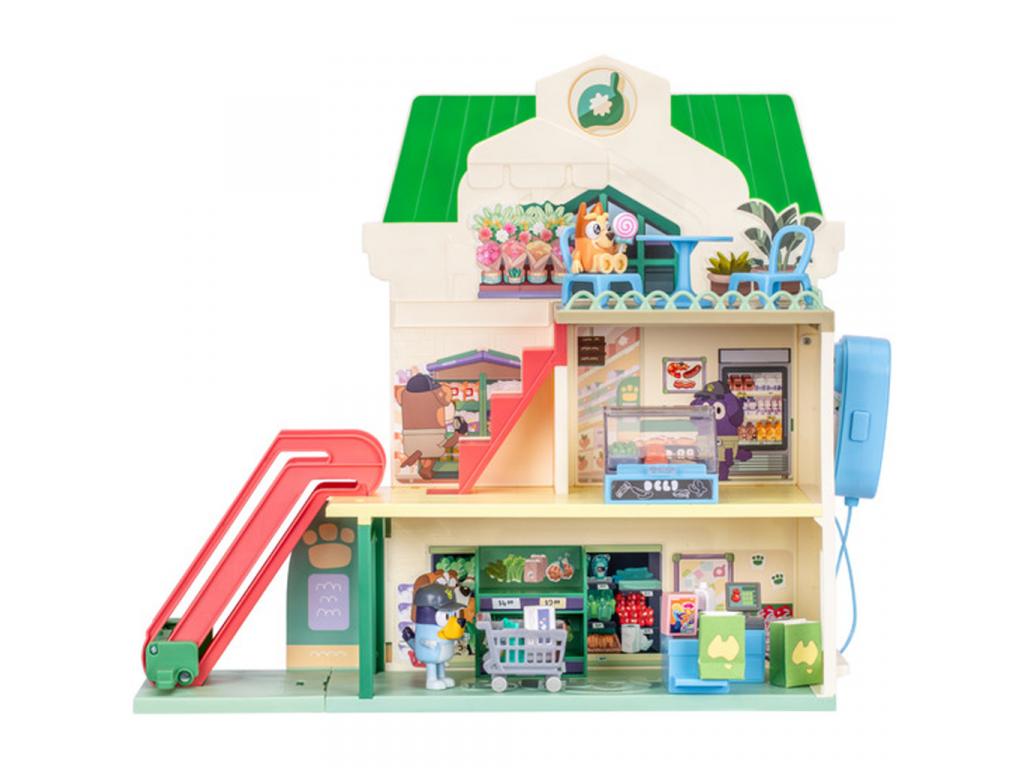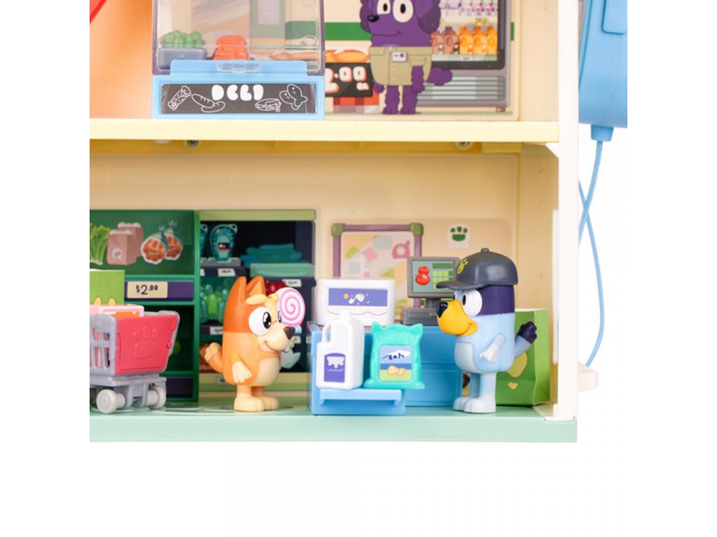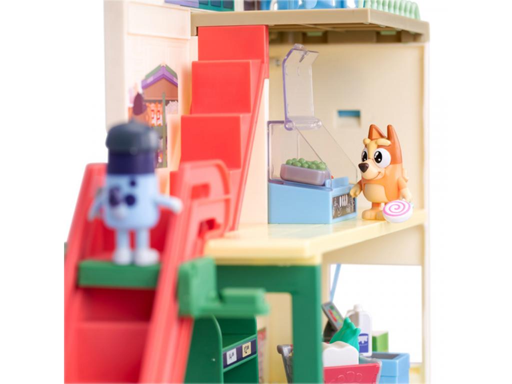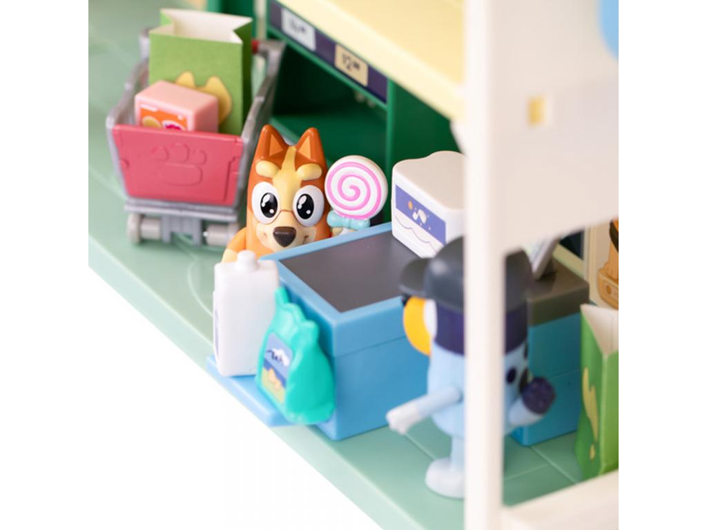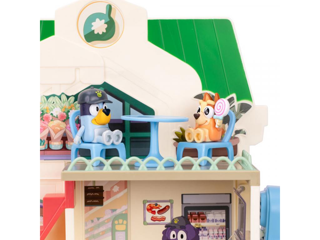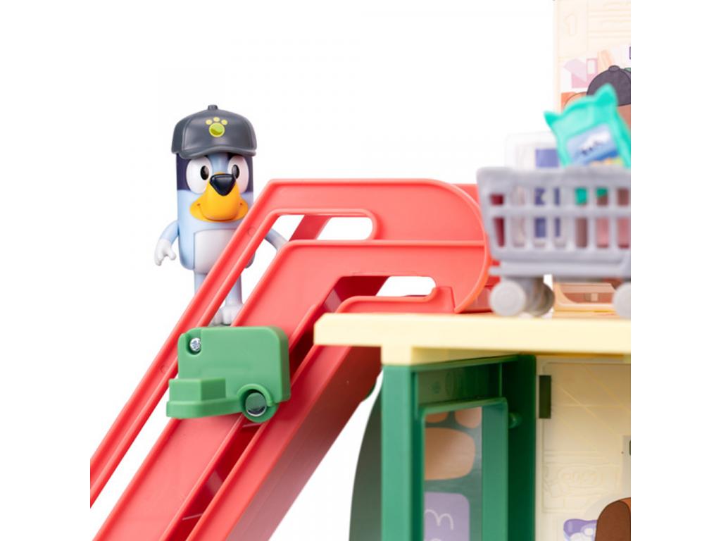 A szettben helyet kapott egy teljes szupermarket épület három emelettel, mozgatható mozgólépcsővel, kasszával, bevásárlókocsival, árukkal teli polcokkal, hűtőpulttal, virágárus standdal, és egy tetőtéri kávézóval is. A csomaghoz tartozik két figura: Bluey boltvezetői sapkában és Bingo, aki éppen egy nagy nyalókával készül fizetni. A gyerekek valóban beleélhetik magukat a mindennapi életbe, miközben játékosan tanulják a vásárlást, pénzhasználatot és a közösségi élményeket.