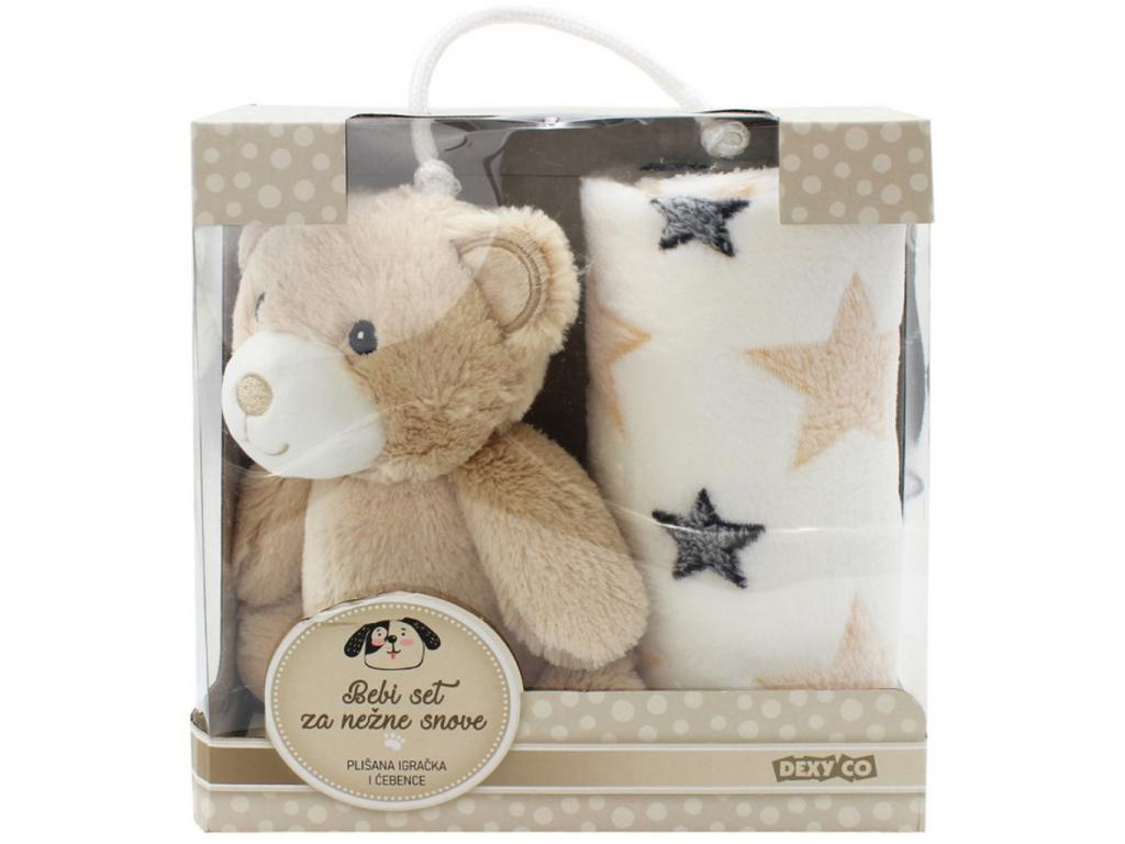 2 részes ajándékszett: barna plüssmackó (15 cm) és puha csillagmintás takaró