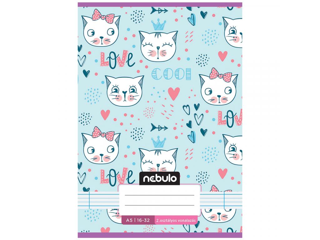 A Nebulo: Tűzött 2. osztályos pasztell kék alapon cica mintás vonalas füzet 16-32 A/5 leírása: