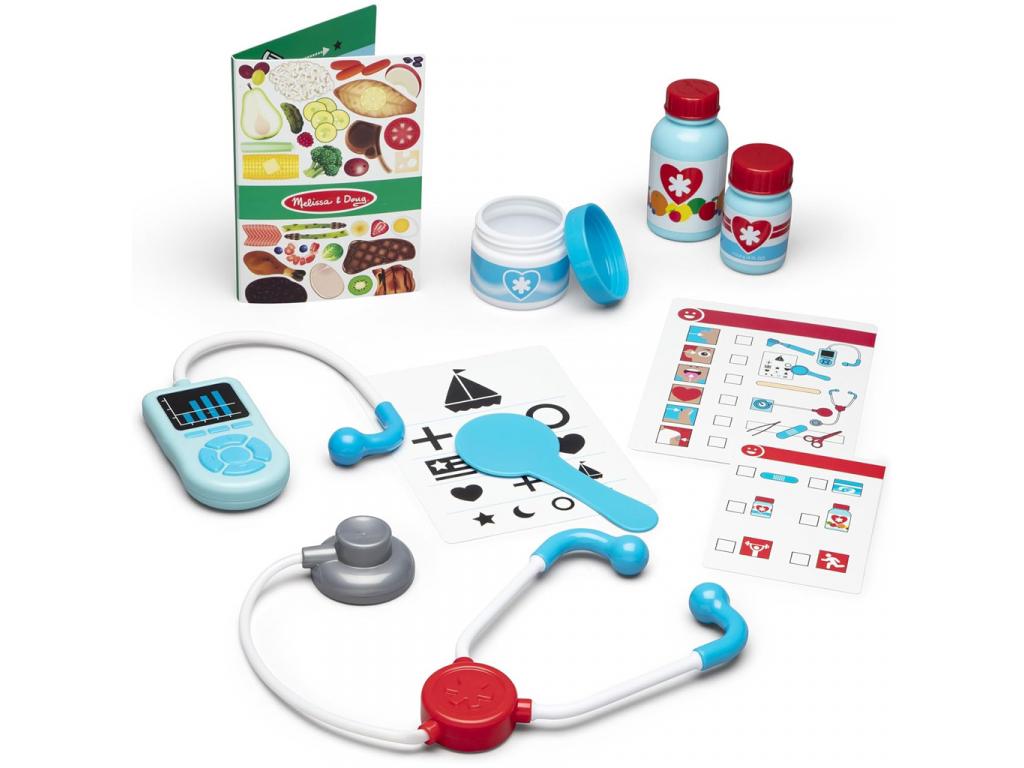 A praktikus, hordozható orvosi táskában minden megtalálható, amire egy kisgyermek orvosi rendelőjében szükség lehet: sztetoszkóp, lázmérő, injekciós tű, csipesz, reflexkalapács, szemvizsgáló tábla, kenőcsös tégely, gyógyszeres üvegek, receptlapok, ragasztócsík, fültükör, nyelvlapoc, vérnyomásmérő, valamint ID-kártya, élelmiszeres brosúra és egy tálca az eszközök tárolásához. Minden eszköz strapabíró műanyagból készült, ergonomikus kialakítással, amely tökéletesen illik a kis kezekhez.
