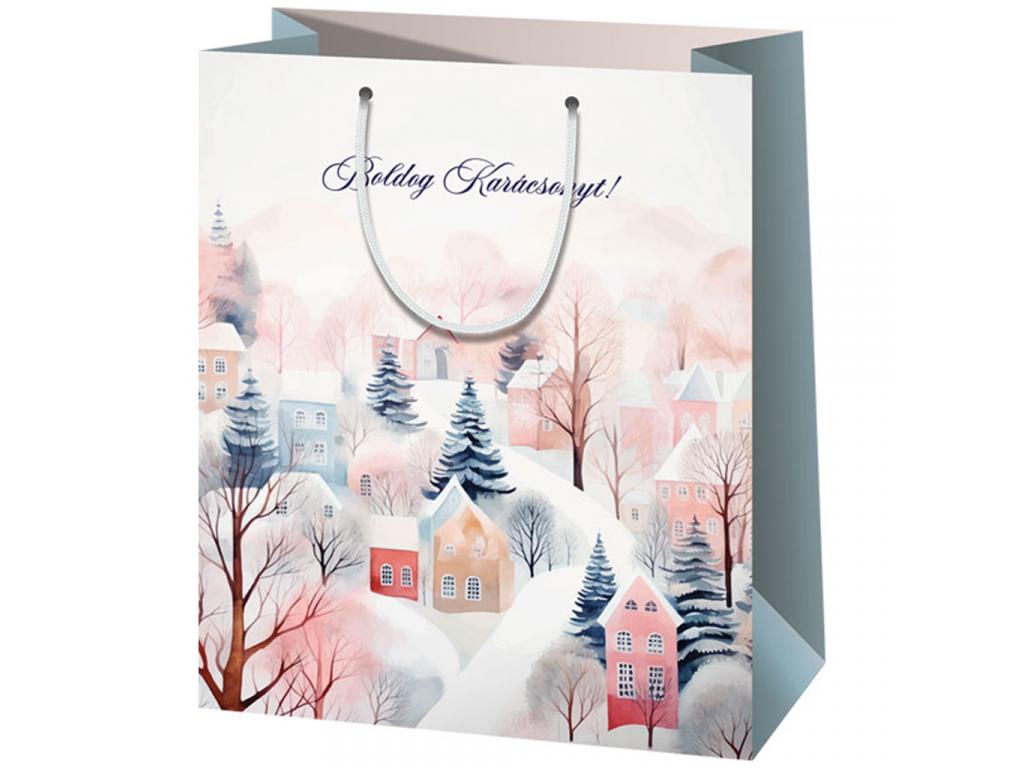 Ha valami igazán hangulatos és békés csomagolást keresel az ünnepi meglepetésekhez, a Havas Házak nagy méretű (26x13x33 cm) ajándéktáska tökéletes választás lesz. A pasztellszínekben megálmodott, akvarell stílusú táj egy mesebeli téli falut ábrázol, ahol hó borítja a házak tetejét és a fenyőfákat. A Boldog Karácsonyt! felirat elegáns, kézzel írott betűtípusa finom ünnepi üzenetet közvetít.