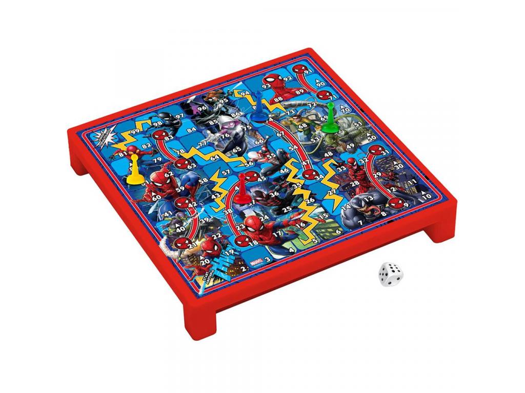 A 29 × 29 × 6 cm-es kompakt játékdoboz tartalmaz minden szükséges elemet: a 4-et egy sorba játékhoz tartozó állványt és korongokat (Pókemberes mintákkal), illetve egy színes, szuperhősökkel teli játéktáblát a Kígyók és létrák játékhoz. A két játék más-más készségeket fejleszt: az egyikben a stratégiai gondolkodás kerül előtérbe, a másikban a szerencse és a játékos versengés. Így változatos élményt kínál, miközben a gyerekek szórakozva tanulnak és fejlődnek.