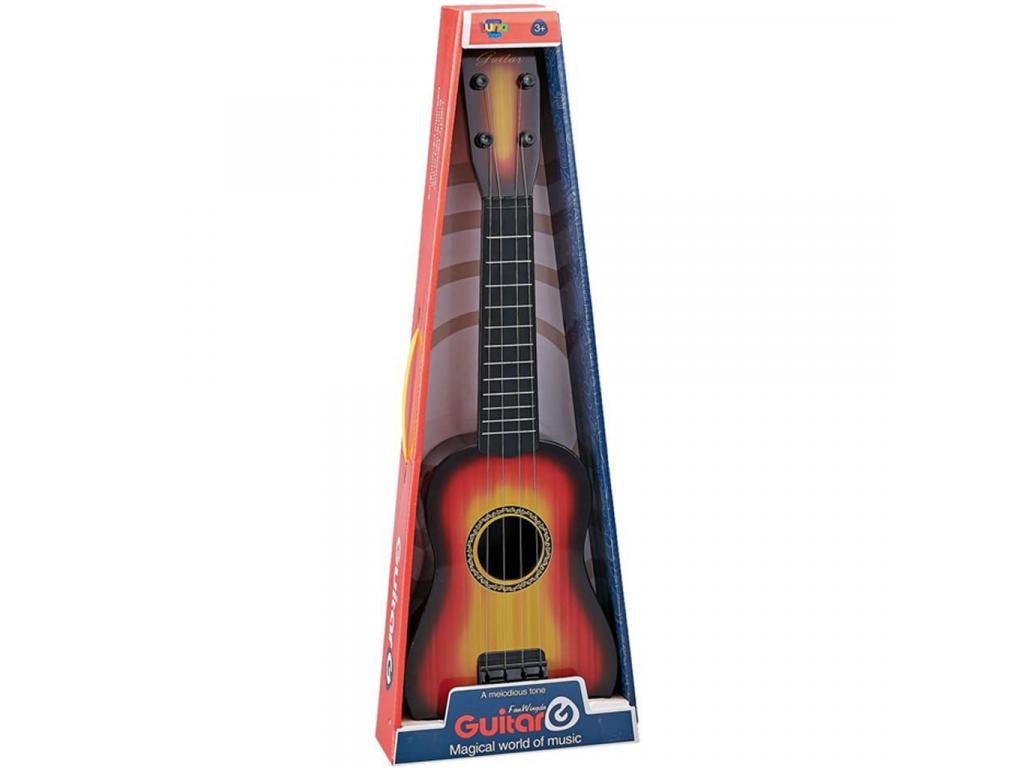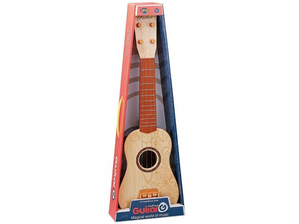 A hangszer nemcsak hangokat ad, hanem segíti a gyermekek hallás- és ritmusérzékének fejlődését is, miközben ösztönzi a kreativitást és javítja a szem-kéz koordinációt. A gitár 4 húrral rendelkezik, amelyek valódi hangokat adnak ki, így a gyerekek játékosan ismerkedhetnek meg az első akkordokkal, dallamokkal és a hangszeres játék alapjaival.