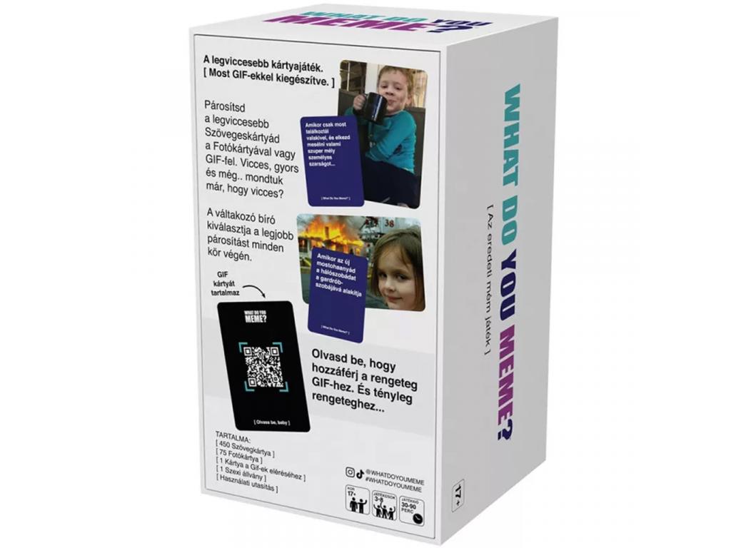 A What Do You Meme? GIF Edition egy szórakoztató, kreatív társasjáték felnőtteknek, amelyben a nevetésé a főszerep. A játék célja, hogy vicces szövegkártyákat párosíts a megadott fotókhoz vagy mozgó GIF-ekhez. A játékosok minden körben kiválasztanak egy-egy szövegkártyát, amit egy képpel vagy GIF-fel kell összepárosítani úgy, hogy az a lehető legviccesebb legyen. A kör bírója dönti el, kié lett a legjobb kombináció, és az kap pontot.