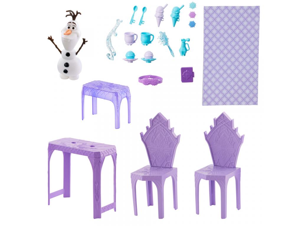 A játékszett több mint 20 kiegészítőt tartalmaz, köztük asztalt, székeket, takarót, jégkrémet és forró csokit, így a szerepjátékoknak valóban csak a képzelet szab határt. Elsa és Anna babák (külön kaphatók) könnyedén beilleszthetők a történetbe, így a testvérek minden kalandban együtt vehetnek részt. Az egész kastély megjelenése és színvilága hűen tükrözi a Jégvarázs világát jégkék, lila és csillogó részletekkel.