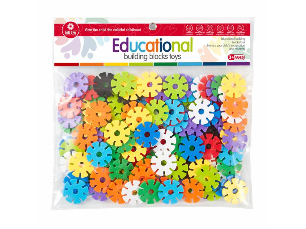 129 darab műanyag építőelem (3,5 cm) készlet, körbefutó bevágásokkal. Példákkal együtt. 3 éves kortól alkalmas.