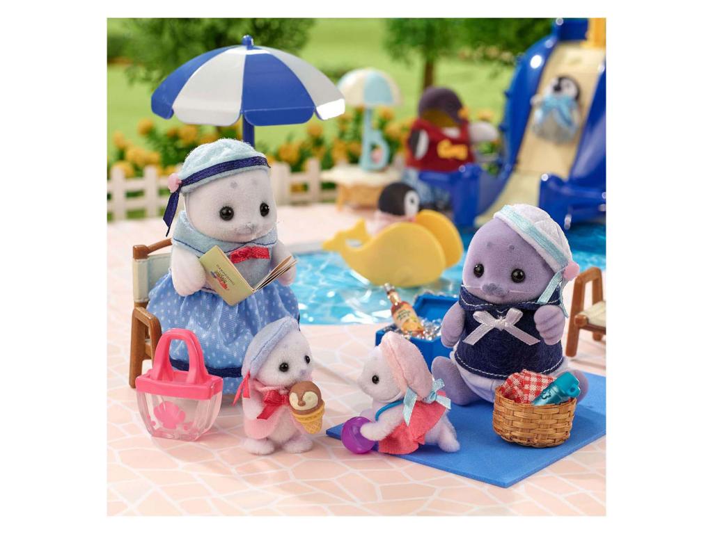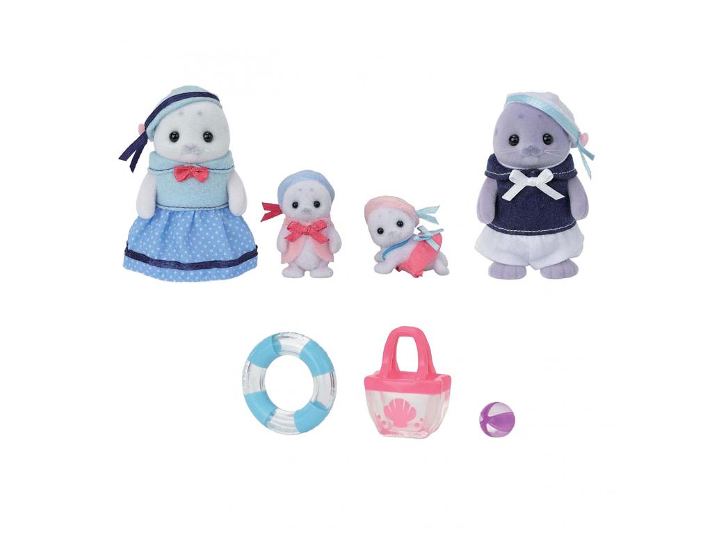 A fókacsalád tagjai aranyos, kerek arcvonásokkal rendelkeznek. Jellegzetes szemöldökhöz hasonló jelölések, bevágott fülek és bajuszok vannak a szájuk körül. A szett tartalmazza az apát, az anyát és a babákat, valamint medence-kiegészítőket. A babák puha, bolyhos textúrájúak. Szép, tengerész stílusú ruhákat viselnek. A figurákhoz bármilyen kiegészítő használható.