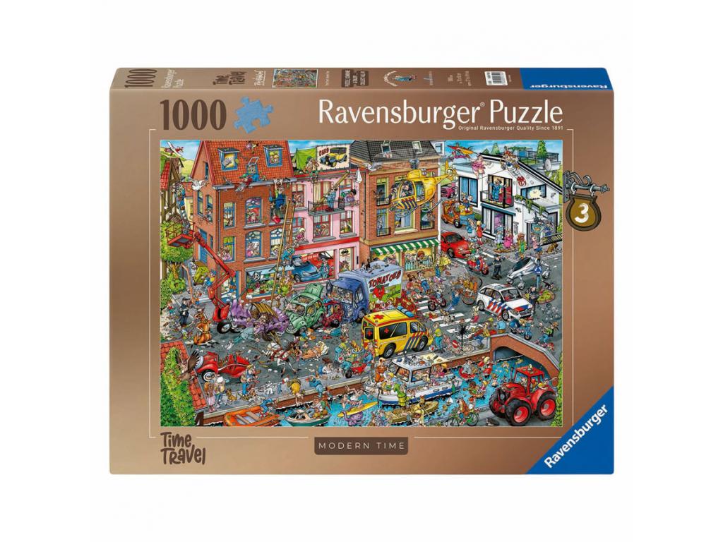 A Ravensburger Puzzle Időutazás 3: Modern idők humorral és részletgazdagsággal repít el a mozgalmas jelenbe. 1000 színes darabjával ez egy vidám és kihívást jelentő puzzle a humoros jelenetek rajongói számára.
