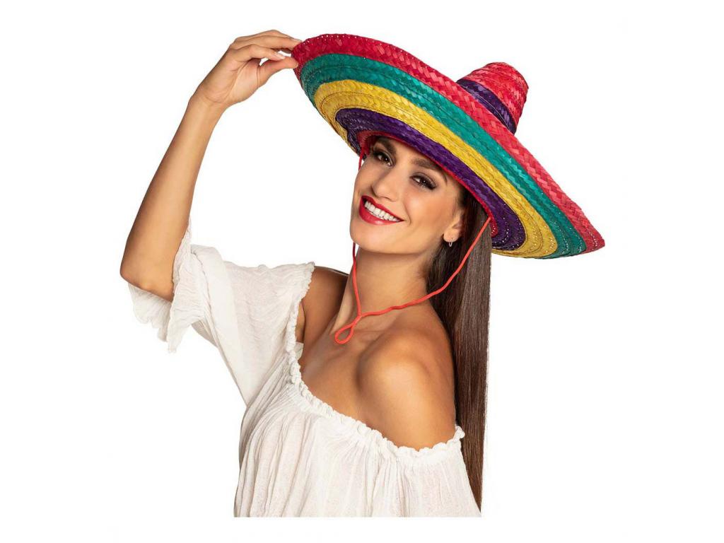 Színes mexikói sombrero, 49 cm átmérőjű, felnőtteknek. Pálmalevélből és poliészterből készült, autentikus megjelenésért. Ideális karneválra vagy mexikói témájú partikra.