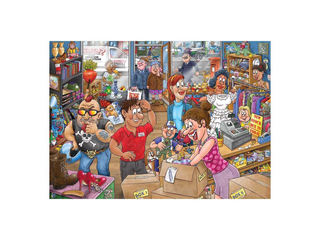A secondhand boltban nyüzsgő forgalom van, mivel a vásárlók izgatottan keresik a jó vételeket. A csillogó ruháktól a vintage játékokig mindenki talál magának valót verhetetlen áron. Épp most érkezett egy új adomány, ami még tovább növeli az izgalmat, de vajon milyen meglepetések várnak rád ezekben a dobozokban? Használja fantáziáját és a megadott tippeket, hogy kitalálja a következő lépéseket. Ez a jelenet, amelyet össze fog állítani. Jellemzők 1000 darabos puzzle felnőtteknek Ne állítsa össze a dobozon látható képet, hanem használja fantáziáját, hogy kitalálja a Wasgij megoldást! A kész puzzle mérete: 68 x 49 cm A Wasgijről Ezeket a Jumbo Wasgij puzzle-ket kifejezetten felnőtteknek fejlesztették ki. Más puzzle-ktől eltérően a Wasgij puzzle-knél nem a dobozon látható képet kell összerakni, hanem a fantáziádat kell használnod a puzzle elkészítéséhez! Három különböző koncepció létezik: Original, Mystery és Destiny. A Wasgij Mystery esetében a nyomokat és a fantáziáját kell felhasználnia, hogy kitalálja, hogyan fog kinézni a jelenet a jövőben. Az egyedülálló Wasgij koncepció arra ösztönzi a felnőtteket, hogy használják a fantáziájukat!
