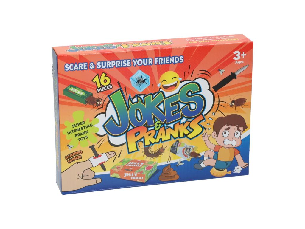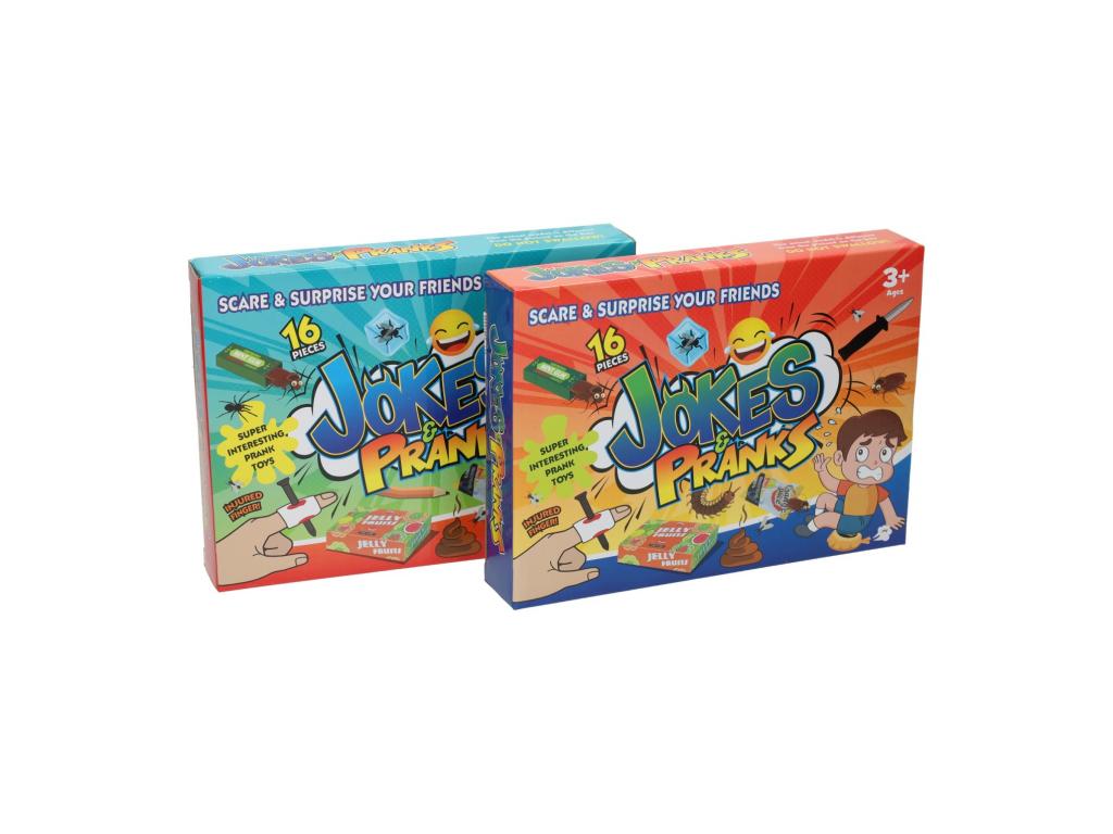 Vicces doboz 16 különböző játékszerrel, például csótányokkal, pudingdobozzal, műszarral és fingós párnával. Műanyagból és gumiból készült. Ideális 3 évesnél idősebb gyermekek számára, akik szeretik a játékos tréfákat.