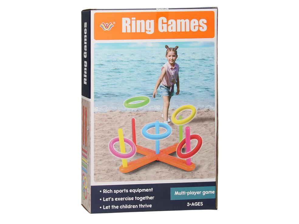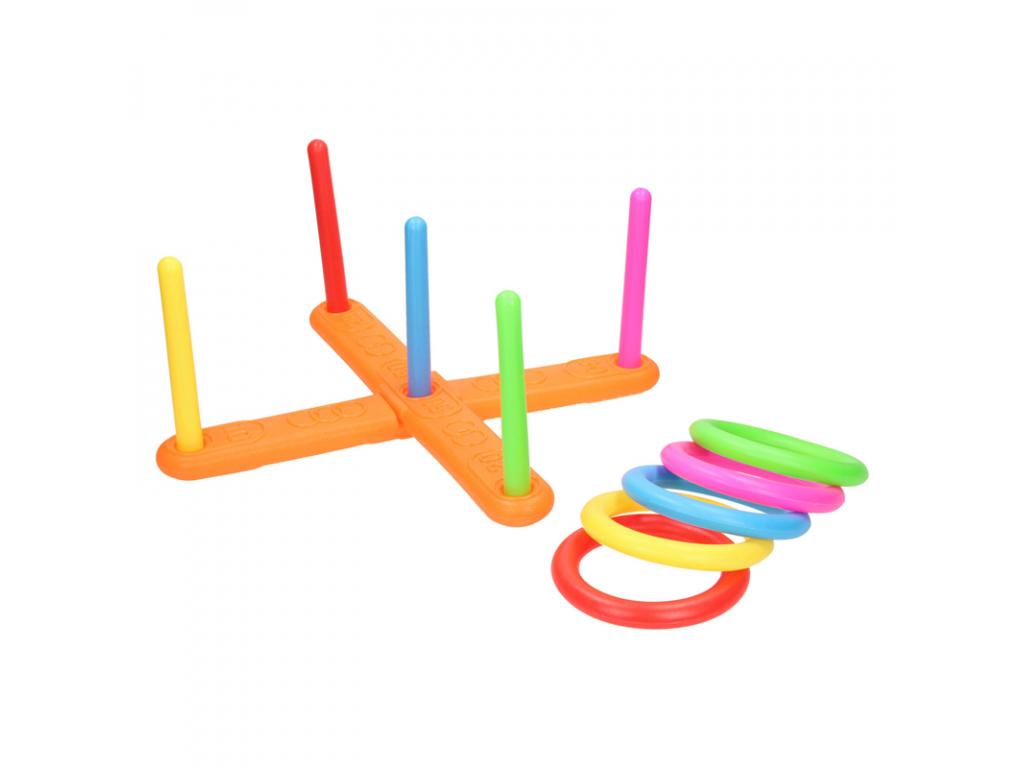 Színes gyűrűdobó játék. Tartalom: 5 db ceruza, 5 db gyűrű és egy kétrészes talapzat. Műanyagból készült, 3 éves kortól alkalmas.