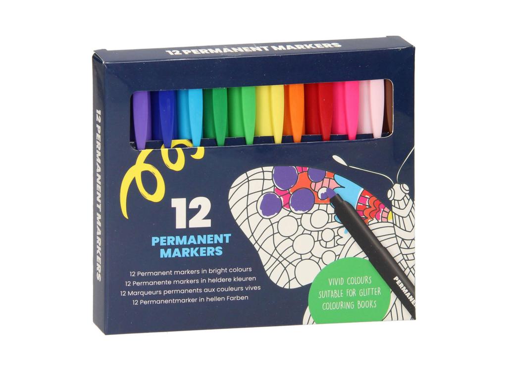 12 db Interstat permanent marker. Ezek a markerek vidám színekkel rendelkeznek és tökéletesen alkalmasak felnőttek számára a színezéshez. Az ideális marker az Interstat népszerű csillogó kifestőkönyveihez.